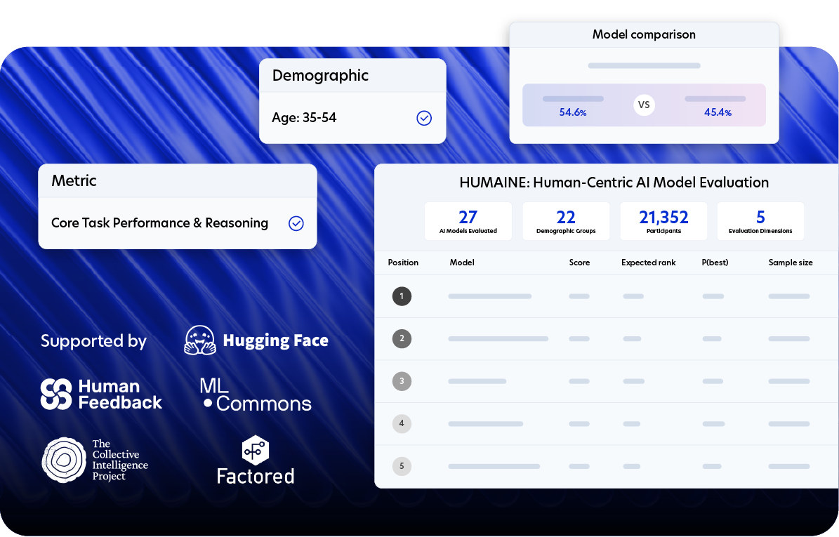 HUMAINE is a public benchmark and evaluation framework for assessing model behavior in real-world, human-facing conditions. Developed through peer-reviewed research and ongoing empirical work, it allows model builders to run human-centered evaluations - supporting systematic comparison, diagnostics, and iteration on deployed models.