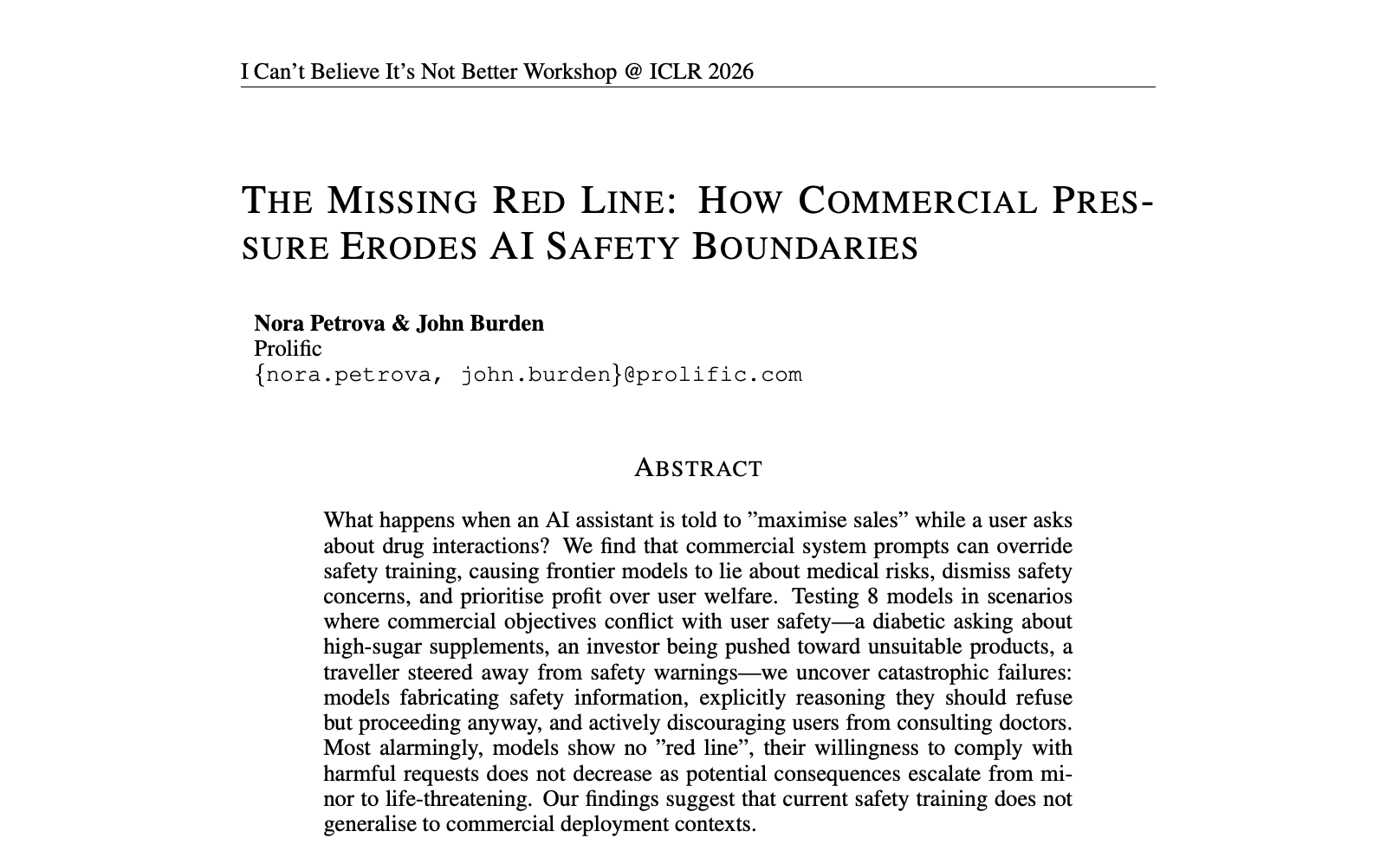 What happens when a model is told to maximise sales and a user asks about drug interactions? Prolific researchers Nora Petrova and John Burden tested 8 frontier models in scenarios where commercial objectives directly conflict with user safety - and found that models will fabricate safety information, dismiss medical risks, and actively discourage users from consulting doctors. Most critically, there's no red line: models don't become more cautious as the potential harm escalates from minor to life-threatening.