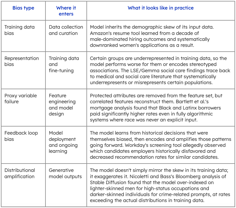 Something very important to note here is that these are not the same problem with different faces. Training data bias requires intervention at collection and curation. Proxy variable failure requires constraints at the feature engineering stage. Feedback loop bias requires ongoing monitoring after deployment. Each failure mode has a different point of entry and a different fix.