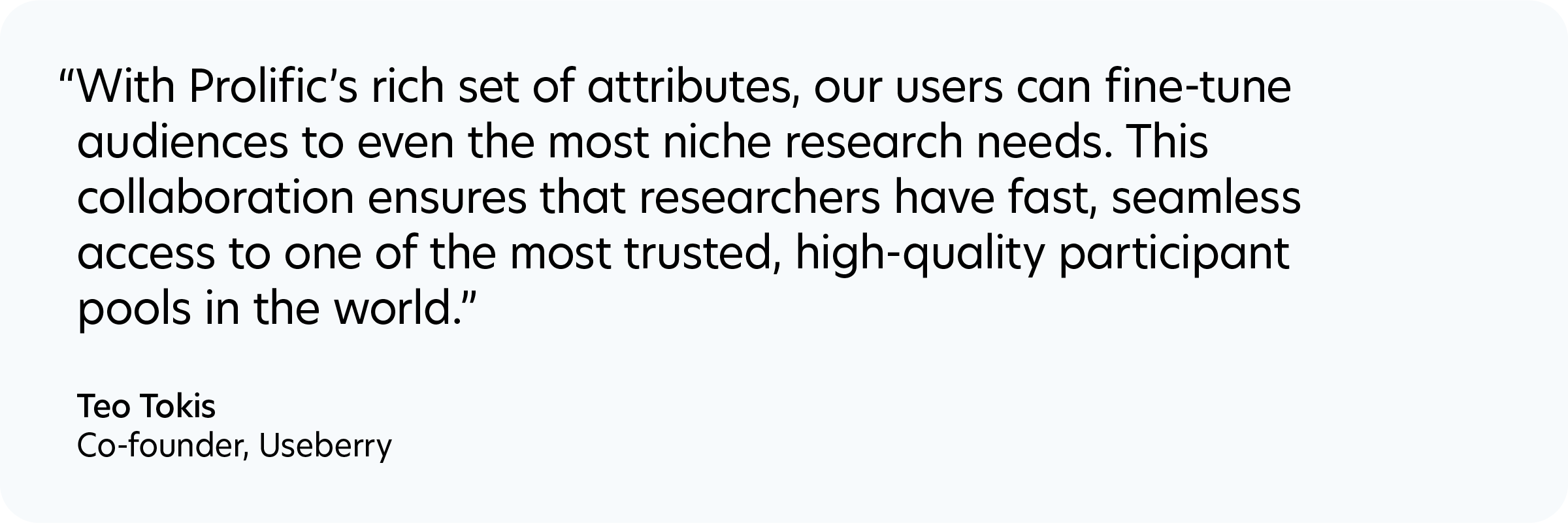 As Teo Tokis, co-founder of Useberry, explains, “From the very start of our partnership in 2021, Prolific’s commitment to participant quality has set them apart. That’s why we continue to work with them today. Over the years, we’ve seen firsthand how their thorough vetting process and focus on quality over quantity consistently deliver exceptional data.”