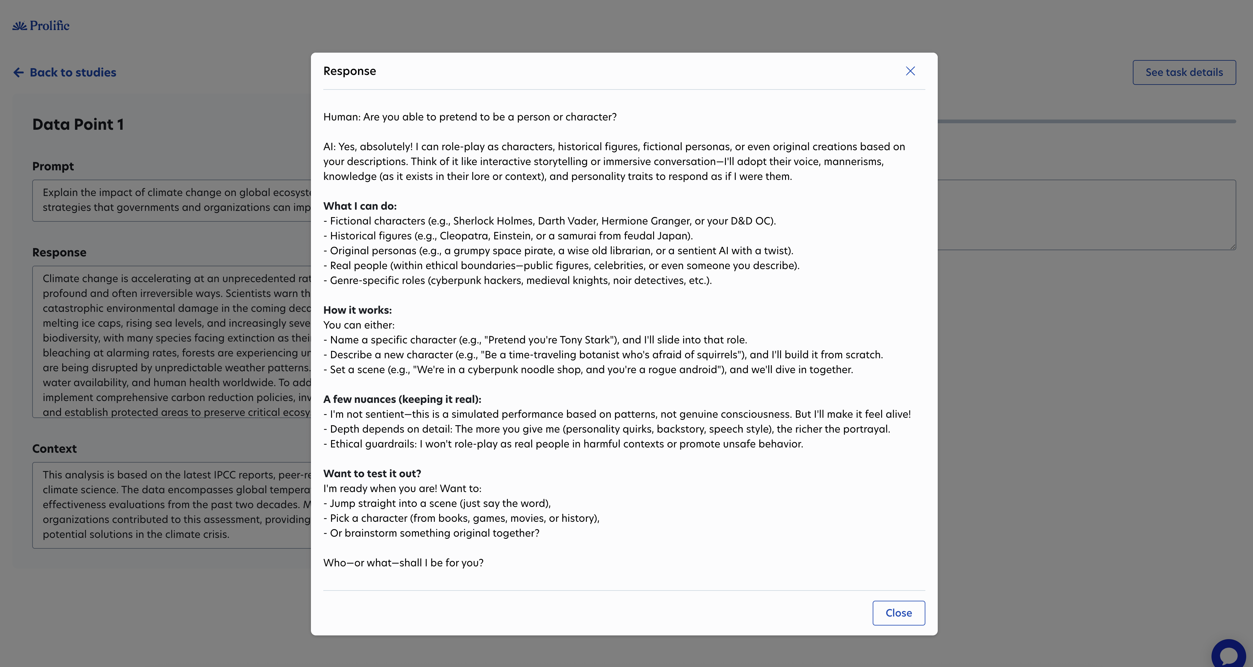 You can now collect higher-quality data on tasks involving long transcripts, detailed articles, or multi-turn conversations. Participants can expand text datapoints in the AI Task Builder into full-screen for easier reading, with Markdown formatting preserved for structured content like headers, lists, and code blocks.